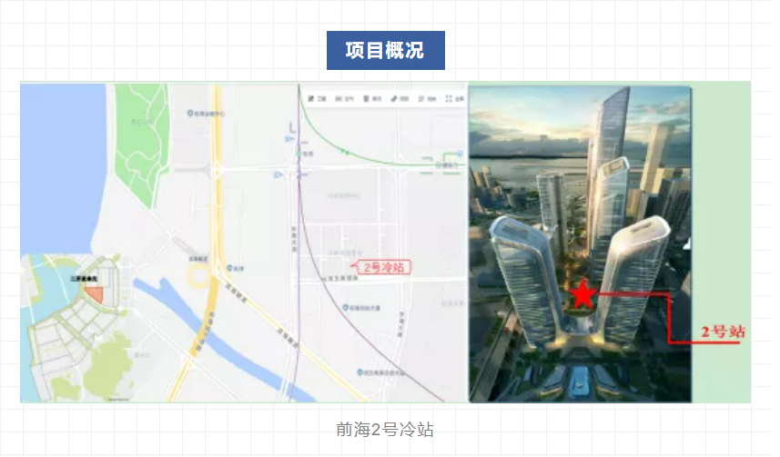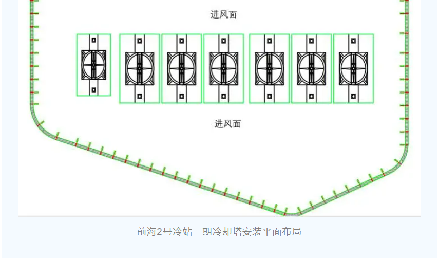 2号冷站项目分两期建设,一期工程供冷服务建筑面积约102万㎡,装机1.32万RT,供冷能力2.12万RT,总蓄冰量7.2万RTH,配置2400RT双工况主机5台,对应设计配置冷却塔15台进行散热,1200RT基载主机1台,设计配置冷却塔2台进行散热,总计一期需配套安装17台冷却塔。