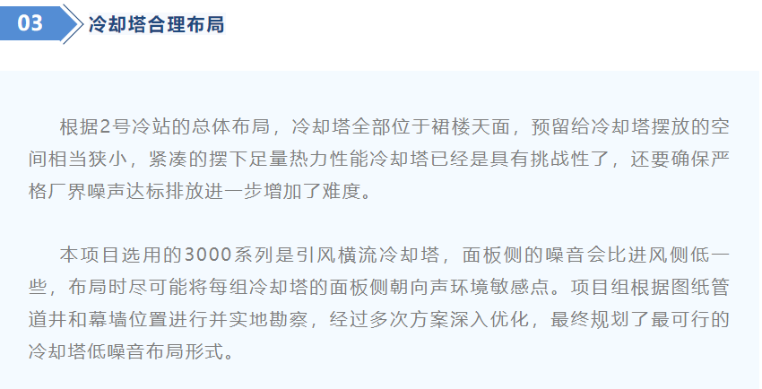 静安2号冷站冷却塔噪声治理项目示范效应明显,国内开展区域供冷的新区到静安调研交流时也十分关注集中冷却塔噪声治理,认为该项目的做法值得推广应用。2号冷站冷却塔噪声治理方式和成果,已经运用落实到静安区域集中供冷项目10号站、5号站以及4号站的设计中,消除周边入驻企业对冷却塔噪声的顾虑,为静安合作区创造良好 的营商环境。