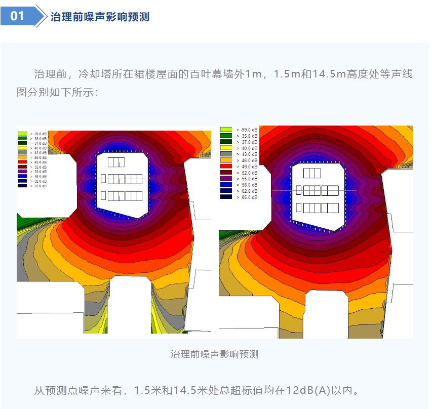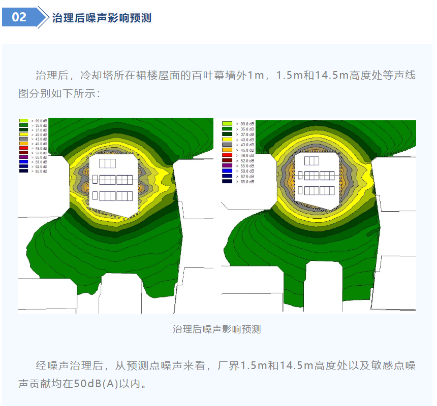 (2)冷却塔所在裙楼,卓越设置有装饰性幕墙,为减少对周边高层敏感建筑的影响,同时要求冷却塔所在建筑物厂界外1米,高于幕墙0.5米处任意一点噪声值,昼间不超过60dB(A),夜间不超过50dB(A)。